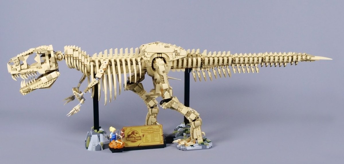 Bej renkte LEGO parçalarından oluşan, detaylı T-Rex iskelet modeli. Plaka ve minyatür figürler içerir.
