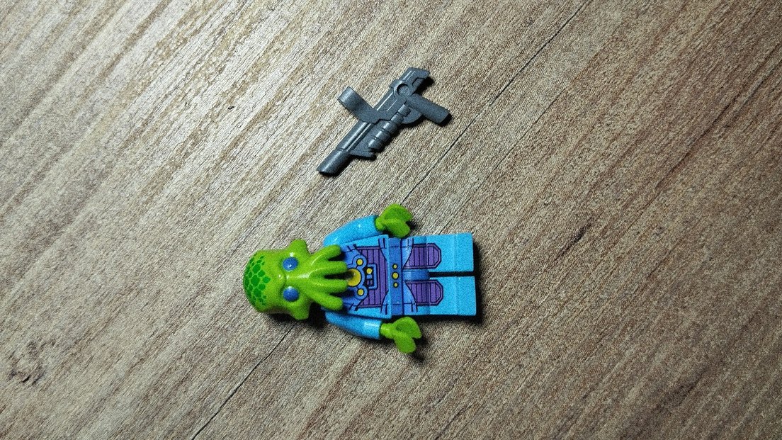 Mavi kıyafetli, yeşil başlı uzay temalı Lego figürü ve detaylı silah aksesuarı. Uzay oyunları için uygun.
