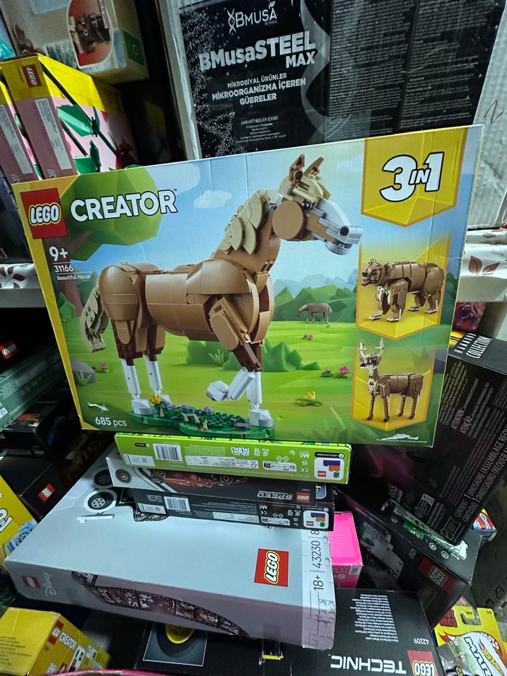 LEGO Creator seti, 685 parçadan oluşan ve 3 farklı model yapılabilen deve renginde bir at modeli içerir. 9 yaş ve üzeri için uygundur.