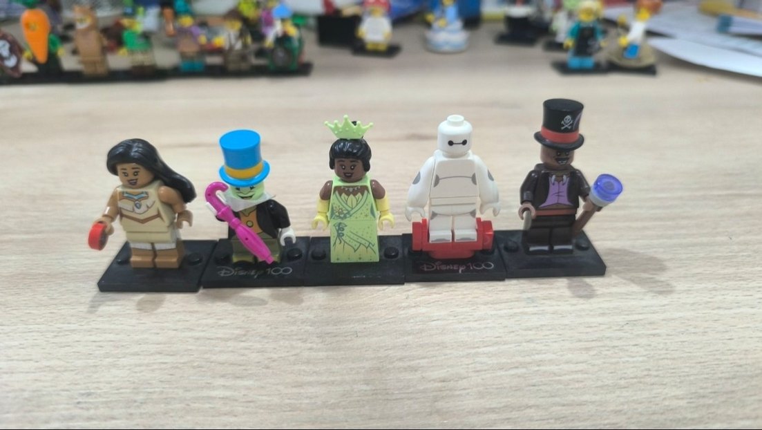 Çeşitli aksesuar ve kıyafetlere sahip renkli Disney 100 Lego figürleri. Siyah standlar üzerinde duruyorlar.