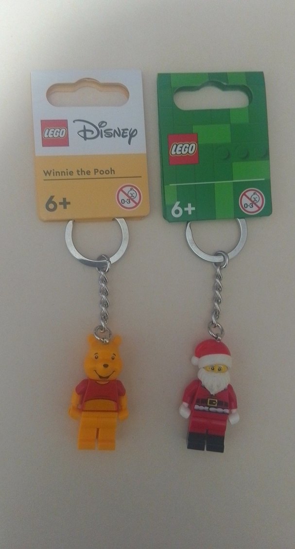 6 yaş ve üzeri için uygun, renkli Winnie the Pooh ve Noel Baba figürlü iki LEGO anahtarlık seti.
