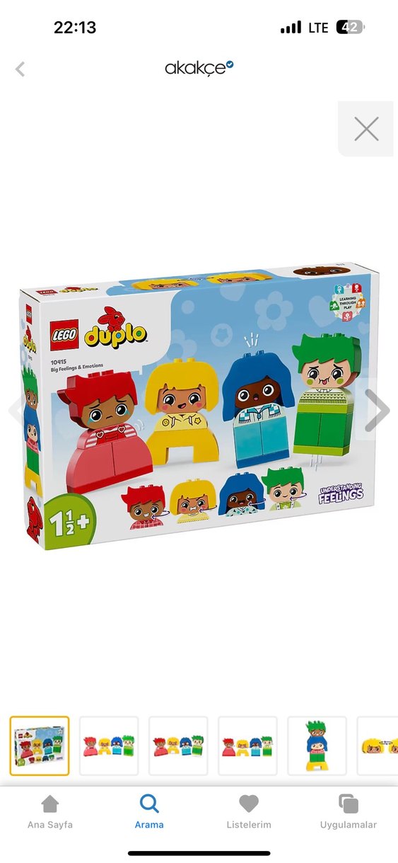 LEGO Duplo seti, farklı duyguları temsil eden renkli figürler içerir ve 1 yaş ve üzeri çocuklar için uygundur. Duygu tanıma ve oyun becerilerini destekler.