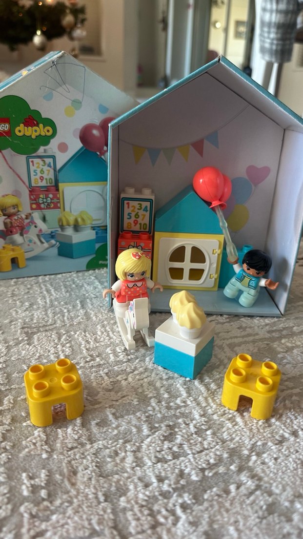 Pastel renklerde LEGO Duplo set, sarı bloklar ve balonlu iki figür ile küçük bir ev içerir. Tüm paaları görselde mevcut. Kutusu ev şeklinde. #lego #duplo #legoduplo
