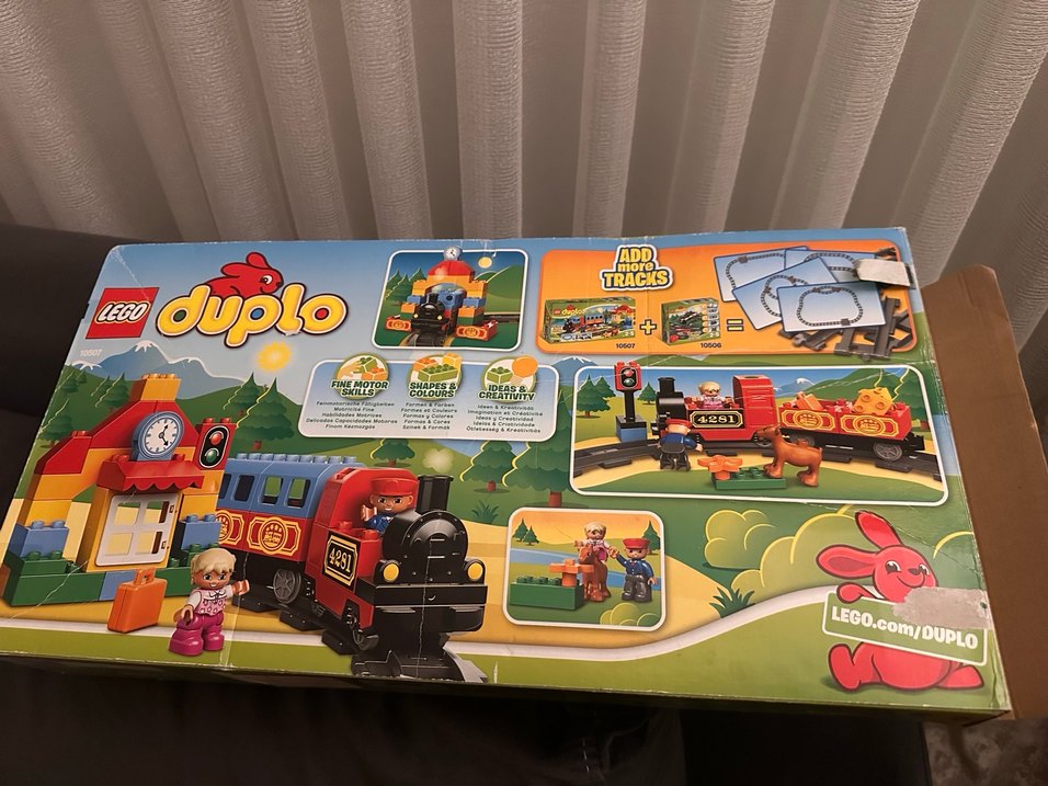 Lego Duplo tren seti, çok renkli ve koyu tonlarda parçalar içerir. İnce motor becerileri, şekilli bloklar ve yaratıcı fikirler sunar. Ekstra raylar eklenebilir. (2. Fotoda mevcut olanlar işaretlenmiştir.)