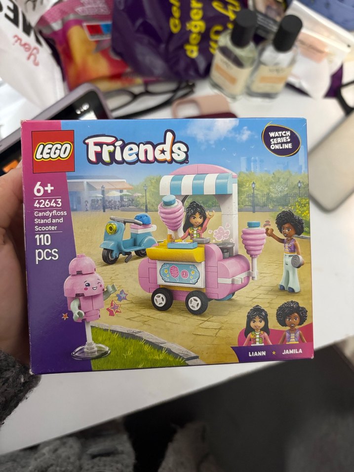 LEGO Friends Candyfloss Stand ve Scooter seti, 6 yaş ve üzeri için 110 parçadan oluşur. Pastel pembe renklerde, Liann ve Jamila minifigürleri ve pamuk şeker aksesuarları içerir.