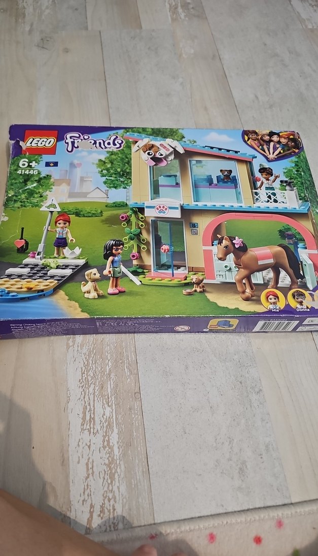 LEGO Friends setinde iki katlı ev, at, köpek ve kedi figürleri ile iç ve dış oyun alanları bulunur. veteriner seti eksiksizdir