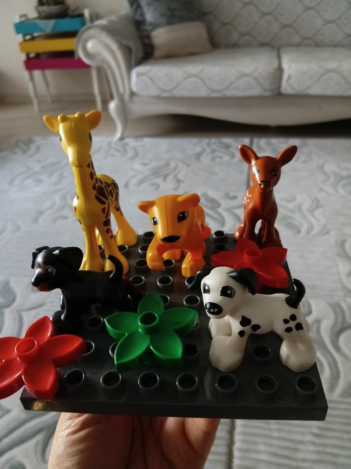 Siyah taban üzerinde çeşitli renklerde Lego hayvan figürleri, zürafa, aslan, geyik ve köpekler ile birlikte çiçek parçaları içerir.