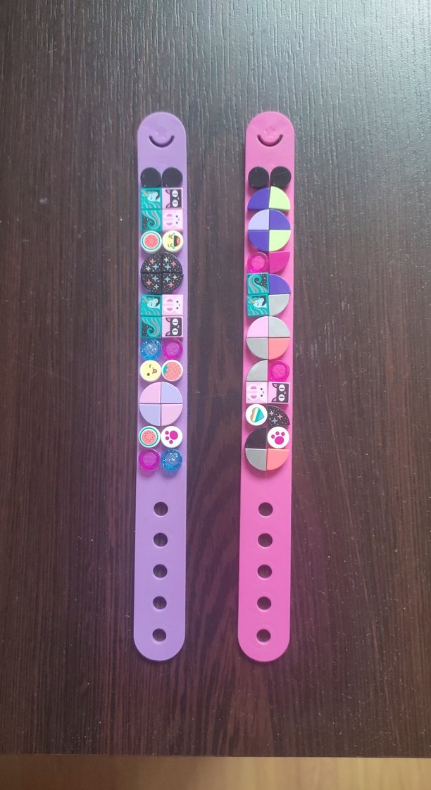 Mor ve pembe renkli, esnek bantlı akıllı bileklikler. Renkli geometrik süslemeler ve ayarlanabilir delikler bulunur.