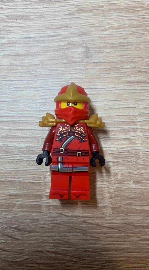 Kırmızı Lego ninja figür, ayrıntılı zırh ve yüz maskeli altın kask içerir. Siyah elleri ve detaylı göğüs desenleri vardır.