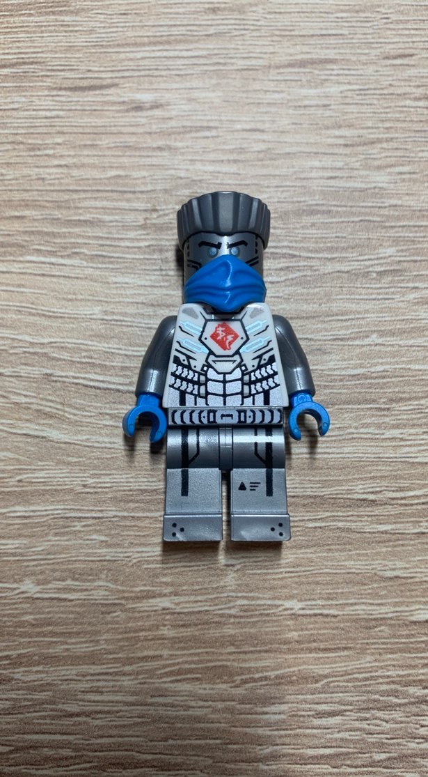 Detaylı baskılı zırh ve mavi yüz maskesiyle gri Lego ninja figürü.