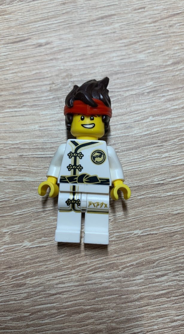 Bu Lego figürü, siyah ve altın detaylı beyaz dövüş kıyafeti ve kırmızı bant ile tasarlanmıştır. Gülümseyen sarı yüz ve koyu kahverengi saça sahiptir.