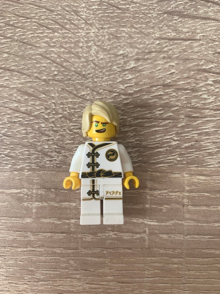 Bu beyaz Lego figürü, detaylı baskılı karate kıyafeti ve sarı saçlara sahip bir dövüş sanatları karakterini temsil eder.
