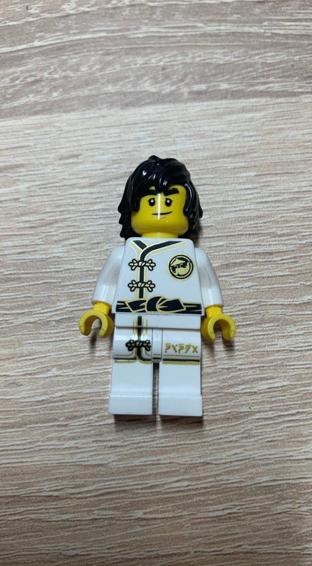 Siyah saçlı beyaz Lego ninja figürü, dövüş sanatları amblemi ve kemer detaylı baskıya sahip.