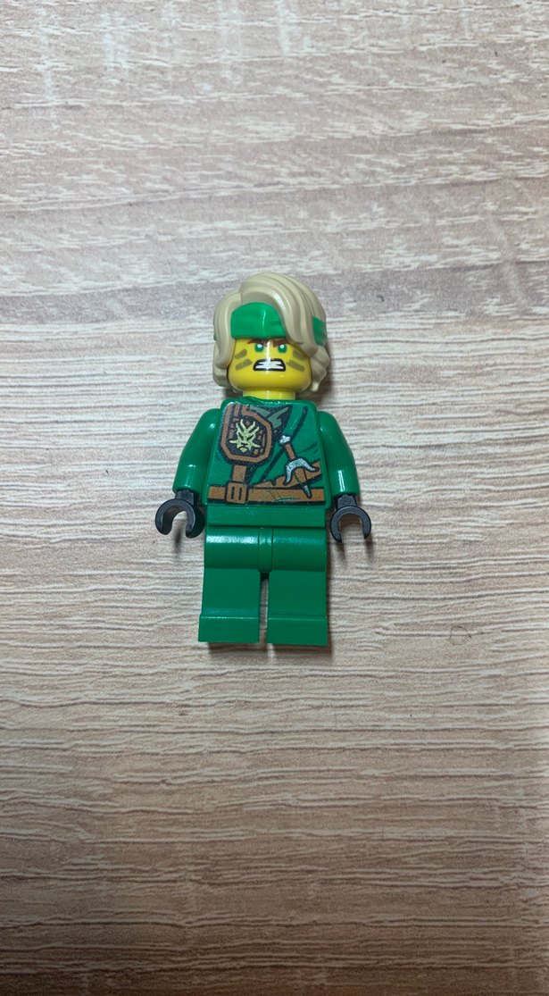 Detaylı baskılı gövdeye ve yeşil kasklı koyu yeşil Lego figürü. Ciddi yüz ifadesi ve siyah ellere sahip. Orijinal