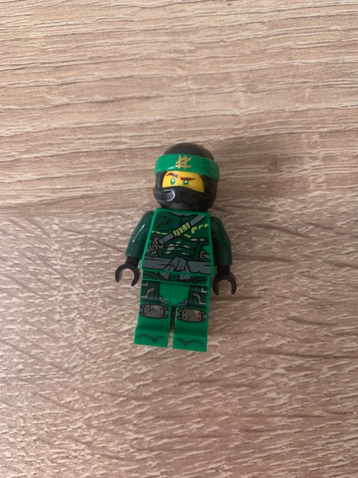 Detaylı zırh ve kasklı koyu yeşil ninja Lego figürü. Sarı yüz ve siyah eldivenlere sahiptir.