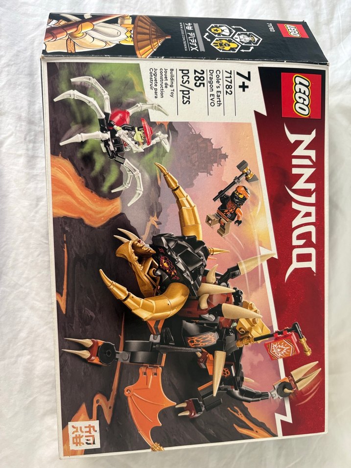 LEGO Ninjago seti, altın ve koyu renkli ejderha figürü ile iki ninja karakteri içerir. 285 parça ile kurulum ve oyun imkanı sağlar.