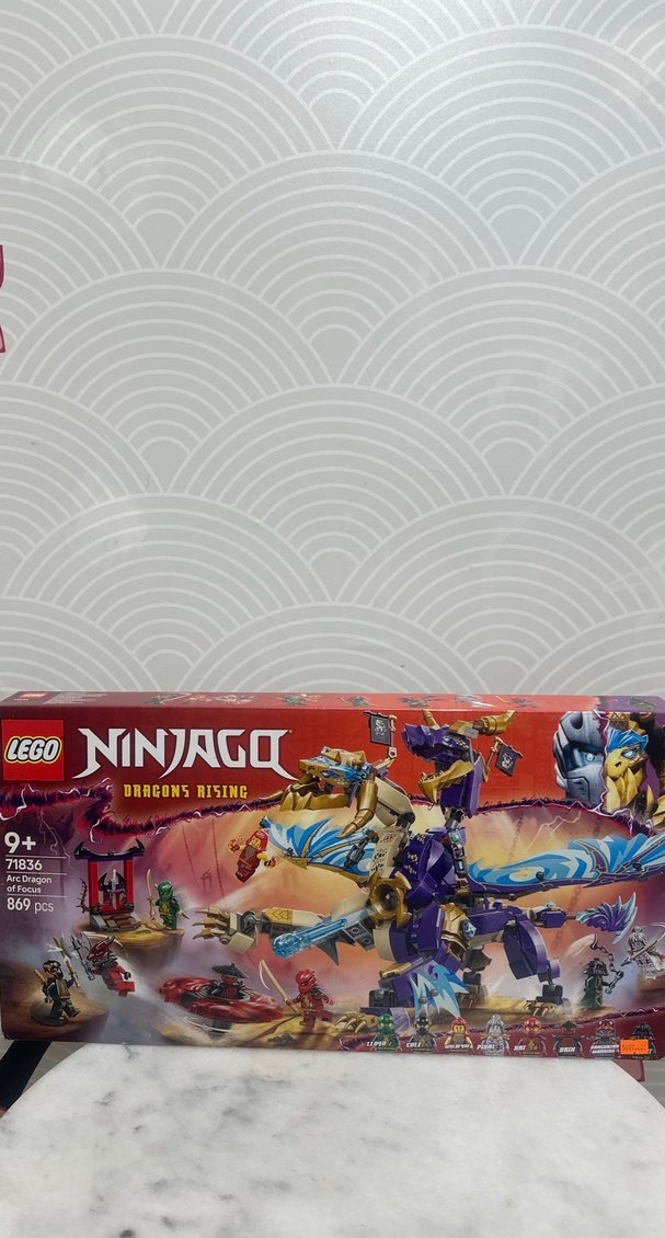 LEGO Ninjago Ejderhalar Oyuncak Seti, büyük mor ejderha ve mavi kanatlarla birlikte çeşitli figürler ve aksesuarlar içerir. 869 parça, 9 yaş ve üzeri için uygundur.