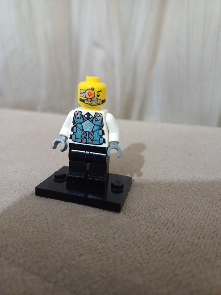Bu Lego minifigürü, gri yelek deseni ve baskılı yüzlü sarı başa sahiptir. Siyah taban plakası üzerinde durur.