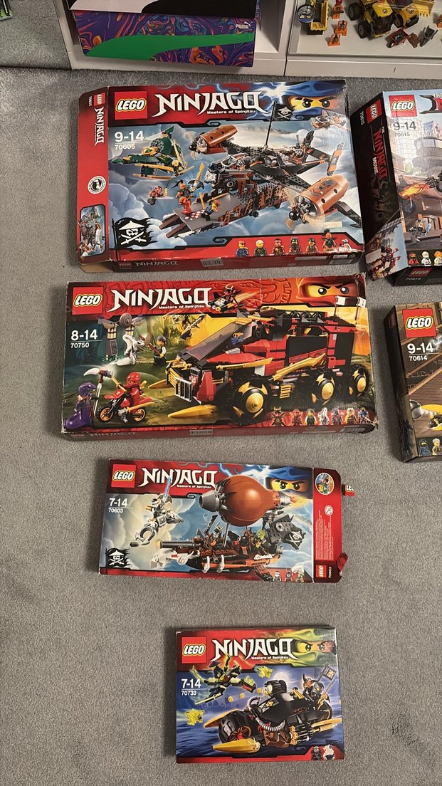 7-14 yaş arası için LEGO Ninjago setleri, koyu kırmızı ve canlı renklerde araçlar ve karakterler içerir.