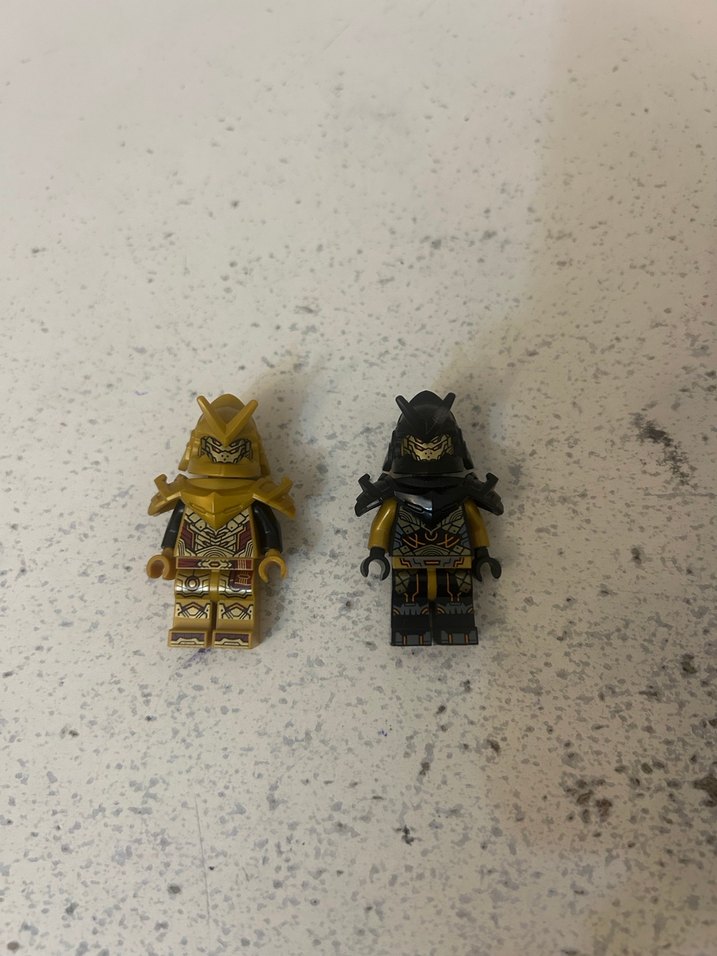 İki adet koyu temalı Lego savaşçı figür, detaylı altın renkli zırh ve miğferlere sahip. Her figürde ayrıntılı desenler ve sert ifadeler bulunur. ️toplam fiyattır.
