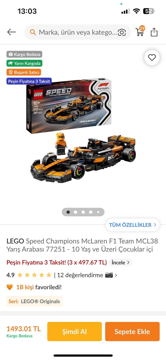 LEGO Speed Champions McLaren F1 Team MCL38 yarış arabası seti, 249 parçadan oluşur ve 10 yaş ve üzeri çocuklar için uygundur. Turuncu ve siyah renklerde detaylı tasarıma ve sürücü figürüne sahiptir. ️