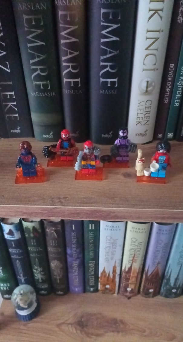 Altı adet farklı kostümlü Lego süper kahraman figürü, aksesuarlarla birlikte ahşap rafta kitapların önünde sergileniyor. Küçük beyaz bir tavşan figürü de bulunuyor. Tanesi 150 liradır.