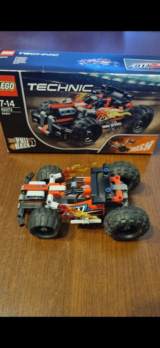 LEGO Technic 42073 seti, büyük lastikli ve alev desenli kırmızı off-road araç içerir. 7-14 yaş için uygundur ve çek bırak motoruyla yarış keyfi sunar.