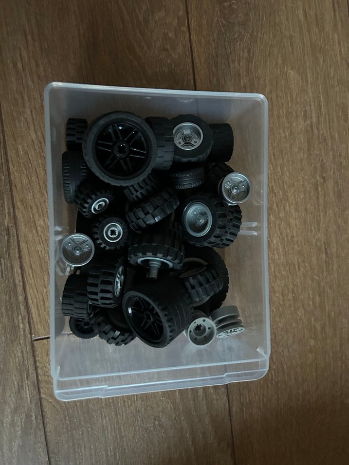 Farklı boyutlarda siyah ve gri Lego tekerlekleri, şeffaf plastik kutuda saklanıyor. Lego araçları için uygun. Çoğu orijinal bazıları uyumlu