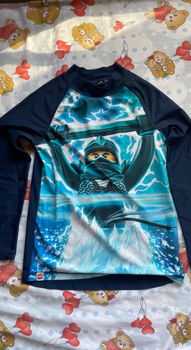 Uzun kollu, lacivert tabanlı ve su sıçraması arka planında ninja karakter baskılı erkek çocuk mayo üstüdür. 6-7-8 yaş hep olur