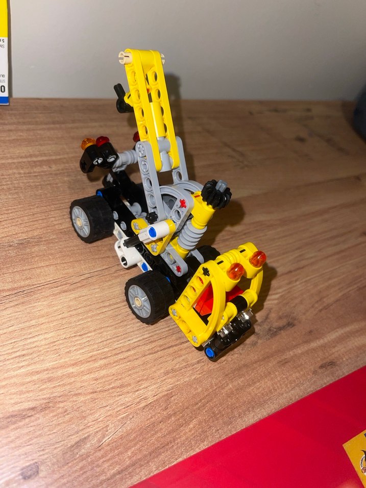 Sarı ve renkli Lego vinç aracı, hareketli parçalar ve tekerleklerle oyun ve kurulum için uygun.