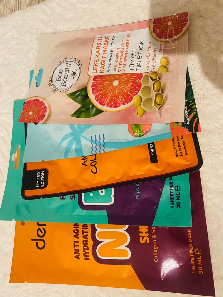 Grapefruit ve E vitamini içeren leke karşıtı kağıt maske ile nemlendirme ve yaşlanma karşıtı çeşitli sheet maskelerden oluşan set.