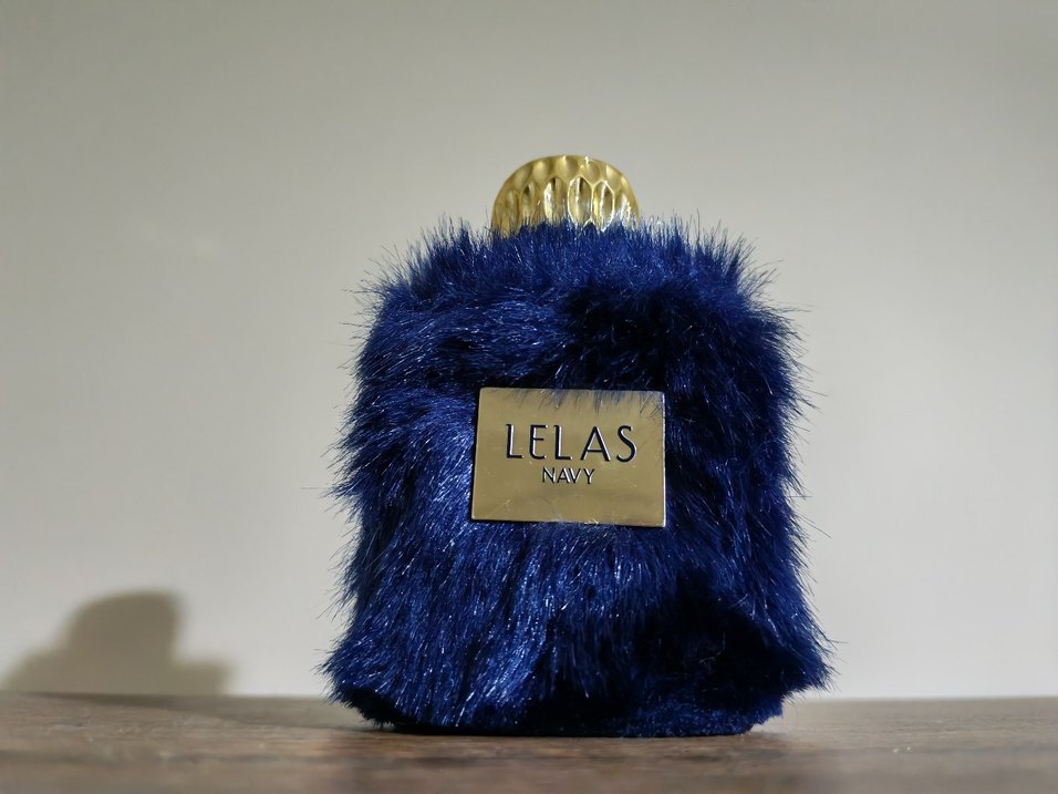 Altın renkli kapak ve etiketli, yumuşak lacivert kürk kaplı Lelas Navy kadın parfüm şişesi. Özgün ve şık bir koku kabı.