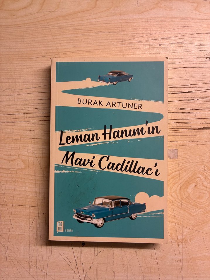 Burak Artuner'in yazdığı "Leman Hanım'ın Mavi Cadillac'ı" kitabı, mavi Cadillac arabaların çizimleriyle kaplanmış turkuaz renkte bir romana sahiptir.