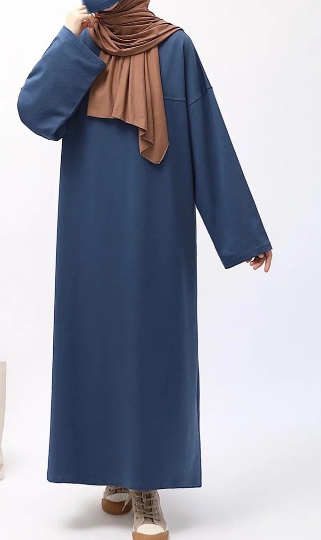 Kadınlar için uzun, bol kesim, yuvarlak yaka ve uzun kollu elbise. Yumuşak sentetik kumaştan, indigo renkte ve günlük kullanım için uygun. Hiç giyilmedi.Standart beden,(38+ beden üstü için ideal)