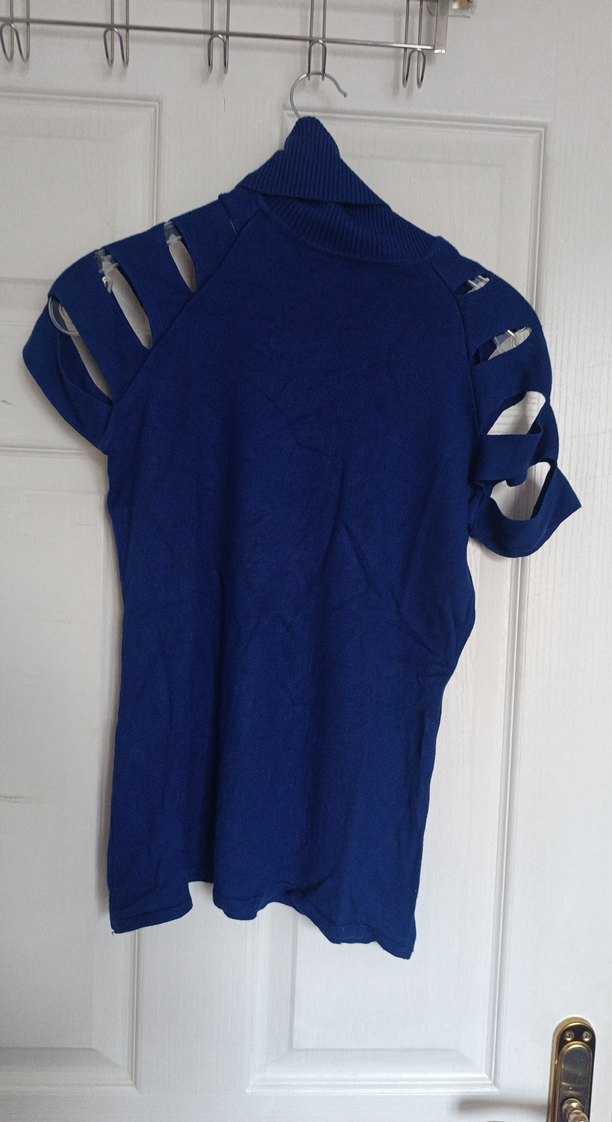 Boğazlı, kısa kollu ve yırtmaç detaylı, görünümlü mavi fitted kazak. Sokak stili için uygun, dış mekan kullanımı için ideal.