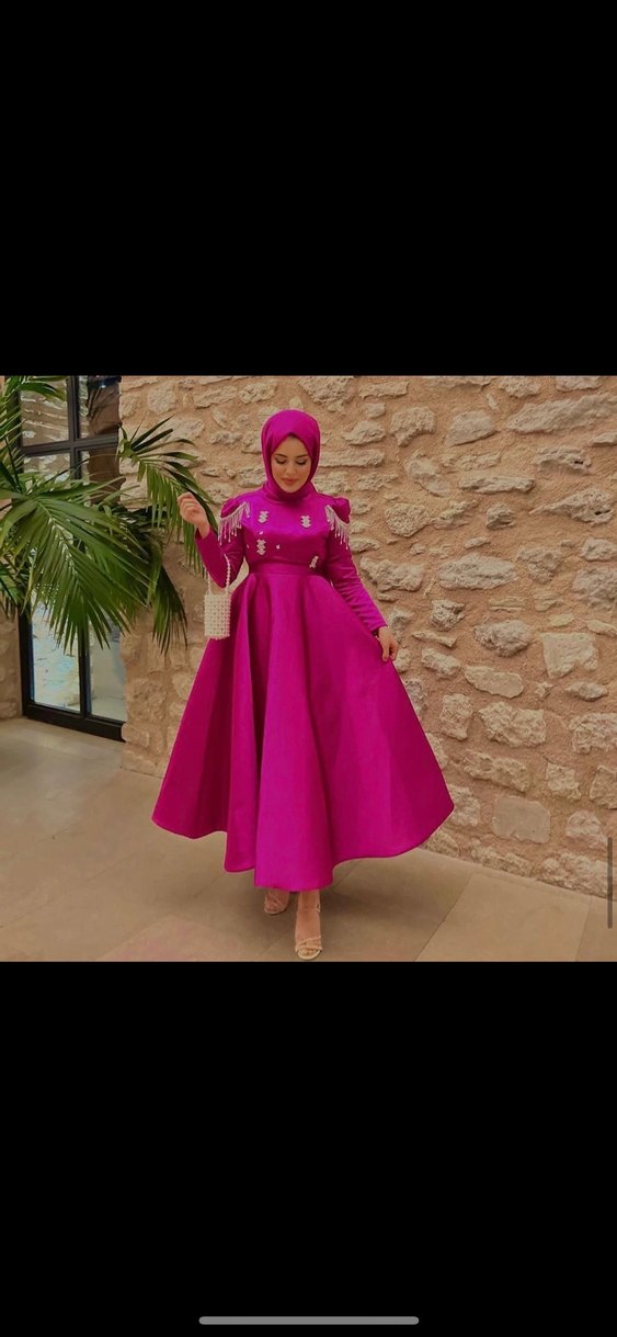 Fuşya renkli, bilek boy abiye elbise yüksek yakalı ve uzun kolludur. düğünler için uygundur 36/38/40 beden için uygundur aynı ton janjan şalı ile gönderilecektir arkası iplidir ve kemeri ile gönderim olacaktır.