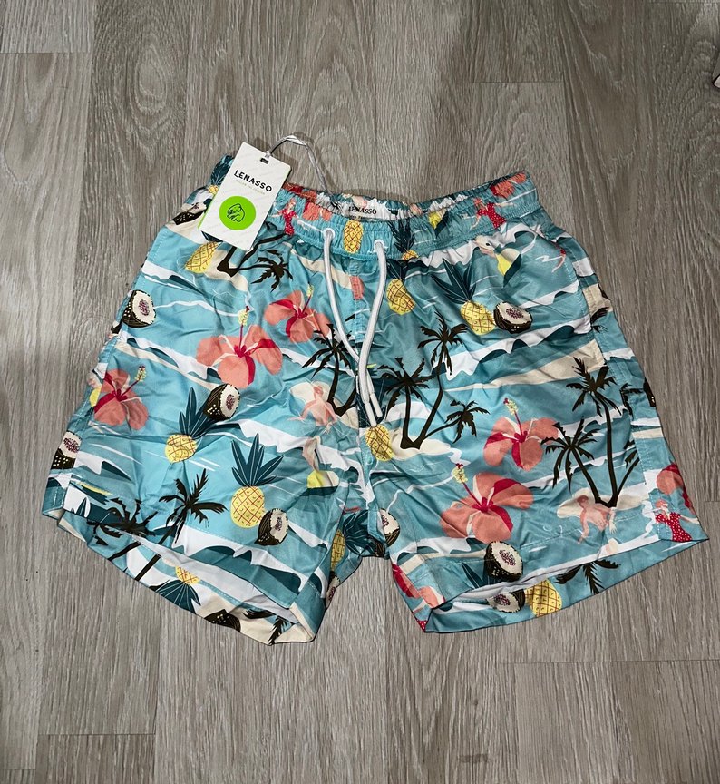 Düğmeli, pastel mavi tonlarında, bol kesim mini erkek deniz şortu. Plajda kullanıma uygun, tie-dye desenli.