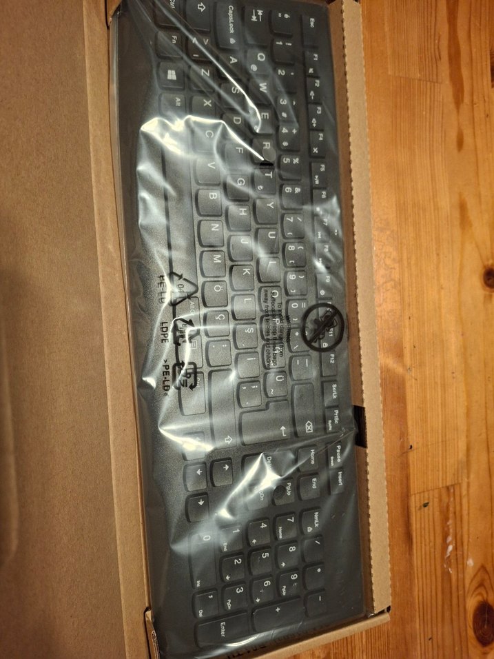 Standart düzenli, siyah kablolu klavye, karton kutuda ve koruyucu plastikle kaplanmış. Tuşlar net işaretli. ⌨️