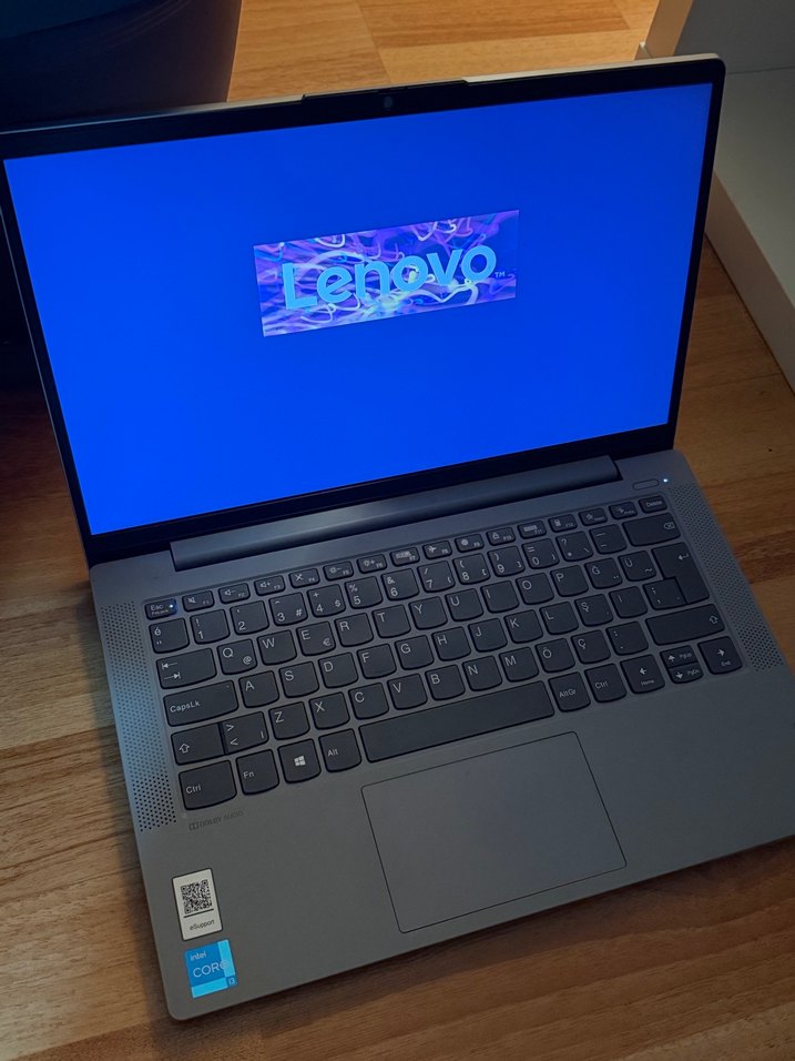 Lenovo marka lacivert laptop, kompakt klavye ve geniş dokunmatik yüzey ile, Intel Core işlemci etiketi bulunuyor.