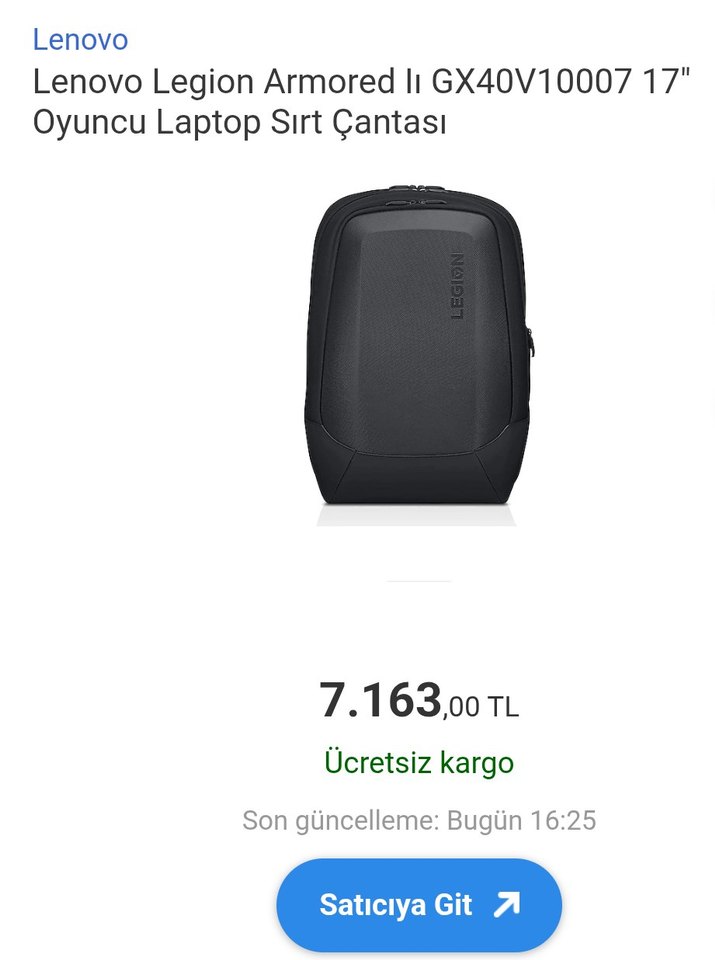 Ürün fotoğraflarda görüldüğü gibidir. Temiz ve kullanıma hazır durumdadır. 17” laptop uyumludur. ️ Lenovo’nun Legion serisine ait dayanıklı ve korumalı modelidir. İç hacmi geniştir, oyuncu ekipmanları ve günlük kullanım için uygundur. Orta göz fermuar değiştirilmiştir ve şu an sağlam durumdadır. Kullanıma engel herhangi bir sorunu yoktur. Sıfır fiyatı 7.000 TL civarındadır. ❗ Pazarlıksız son fiyattır