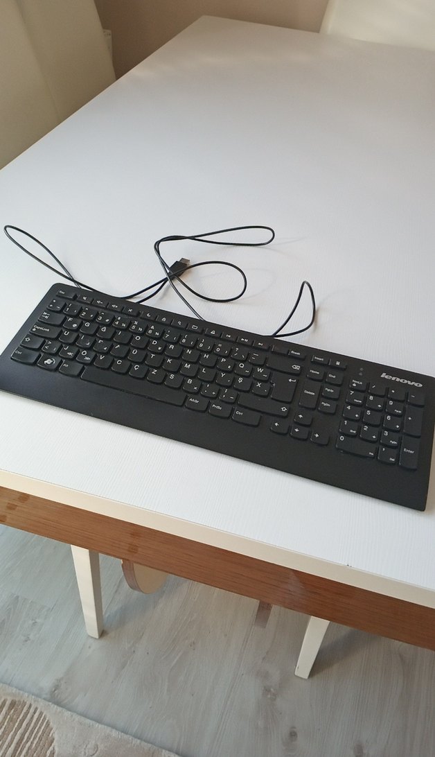 Lenovo marka, tam düzenli ve sayısal tuş takımlı, USB kablolu siyah klavye. İnce tasarımıyla çeşitli masa düzenlerine uyum sağlar. Katiplik için F Klavye. ⌨️