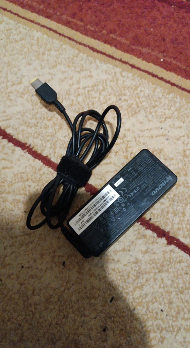 Lenovo marka siyah laptop şarj adaptörü, kompakt tasarıma ve bağlı kabloya sahiptir. ⚡