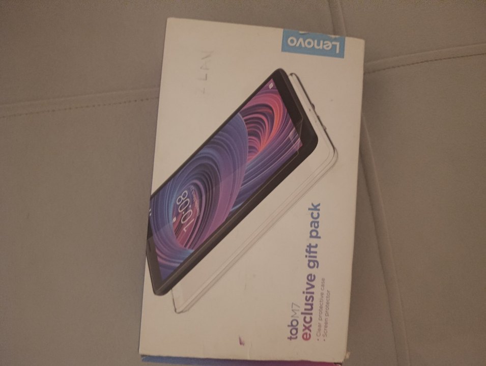 Lenovo Tab M7 Android tablet, bej renkte ve koyu ekranlı, özel hediye paketiyle sunulmaktadır. iç ekranı kırık
