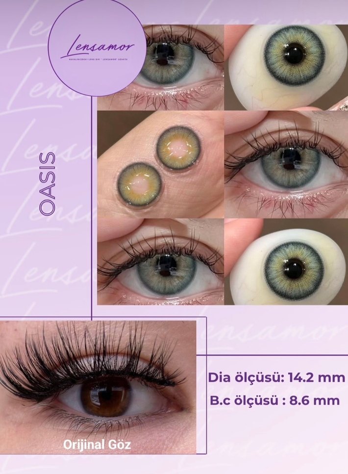 Lensamor Oasis pastel haki renkli kontakt lensler, 14.2 mm çap ve 8.6 mm baz eğrisi ile doğal göz rengini hafifçe vurgular.