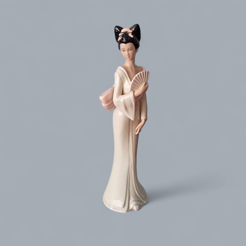 Pastel renklerde, yelpaze tutan beyaz porselen geyşa biblo. Zarif detaylarıyla dekorasyona sanatsal bir dokunuş katar. İngiliz Leonardo Collection marka. Yükseklik yaklaşık 30 cm. Yeni durumdadır. Fiyat sondur y