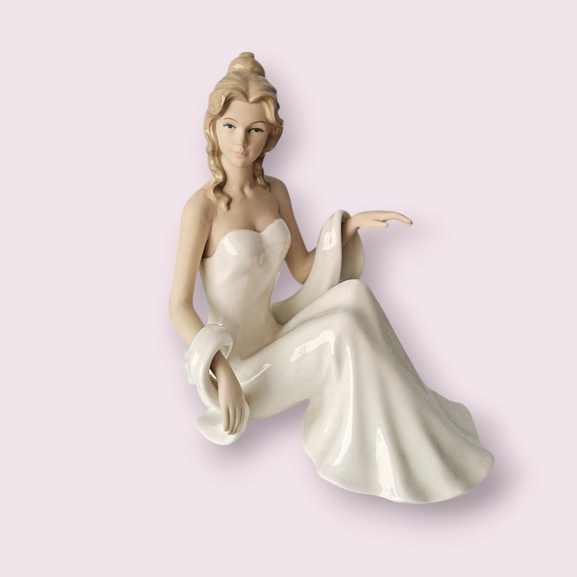 Uzun elbiseli oturan kadın figürini, beyaz ve açık tonlarda, pürüzsüz detaylara sahip. Annie Rowe imzalı, Leonardo Collection marka. Ölçüler 16*17 cm. Temiz ve defosuz. Fiyat sondur ‼️