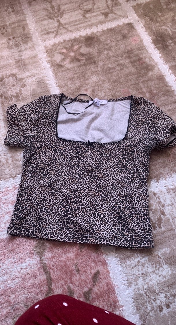 leopar desenli, kısa kollu, tekne yaka, vücuda oturan, kahverengi baskılı mini bluz. Hafif sentetik kumaştan, günlük rahat stil için uygun. xs-s yazıyor ama m bedene ve L ye de olur