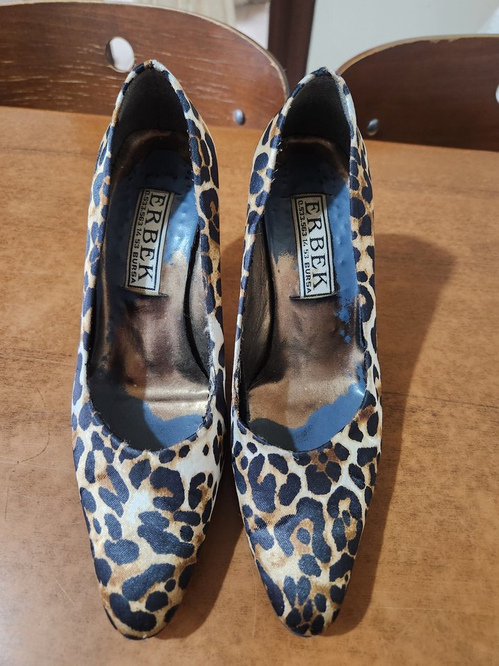 8 cm topuk boyu stiletto ama çok rahat bir gece ayakkabısı saten leopar 37ve 37 buçuk giyene olur içinde renk koyulasma var fotoda belirli dıştan kullanıma engel degil