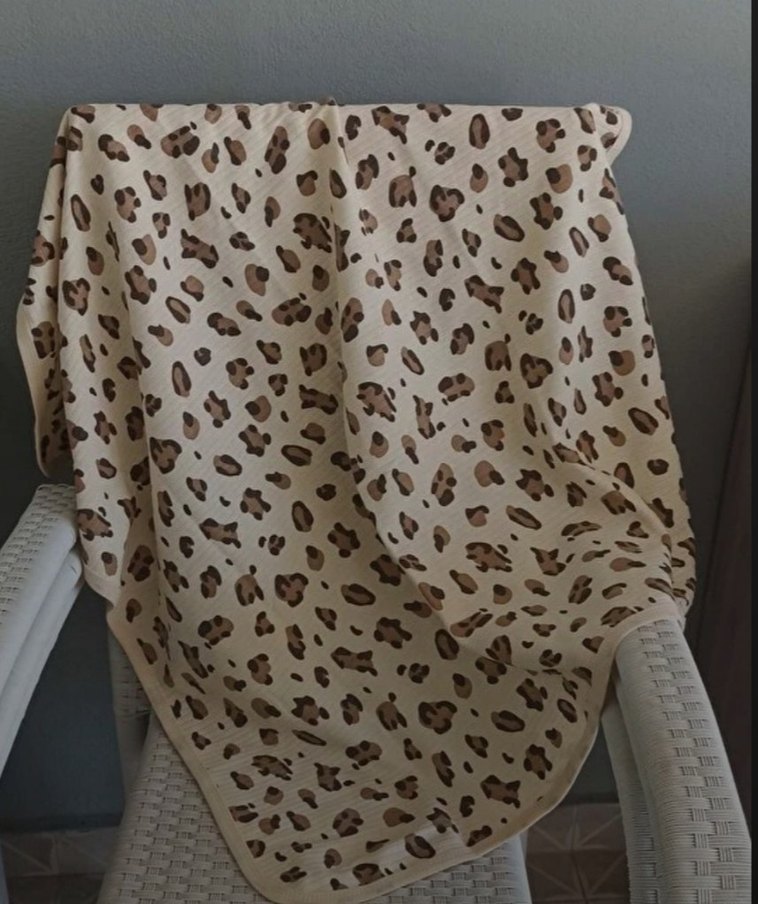Leopar desenli açık kahverengi battaniye, yumuşak ve rahat bir dokunuş sağlar.