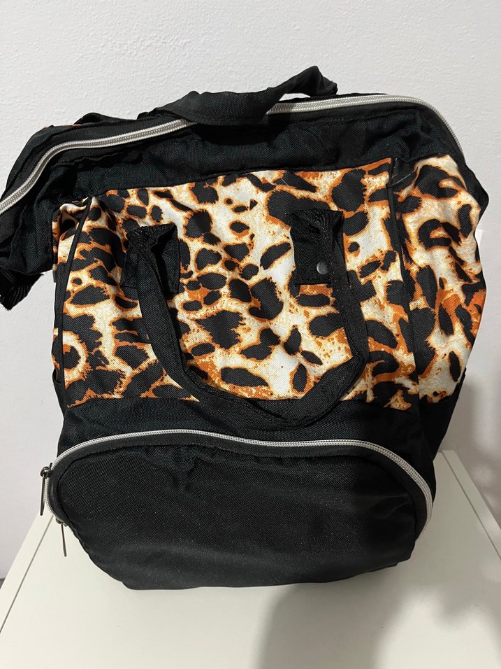 Leopar desenli koyu kahverengi bebek çantası, çok bölmeli ve sağlam tutma saplarına sahip.Az kullanılmış temiz ve sorunsuz.Daha büyük çanta kullanmayı tercih ediyorum bunu kullanmıyorum.